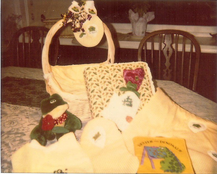 The one below was all about Bears.  A suncatcher for the window of the baby that was a bear (I was doing stainglass at the time, too)  There was a gingham burp drool and tinkle set in the basket-which was a teddy bear basket with the head on the one end and the legs and arms on the side.  If you want any further instructions or amounts of fabric etc.  You can always find me at G Street Fabrics in Rockville, MD ...Sun.  Mon. Tues.  or just email me ... at kittykittypurrs@gmail.com